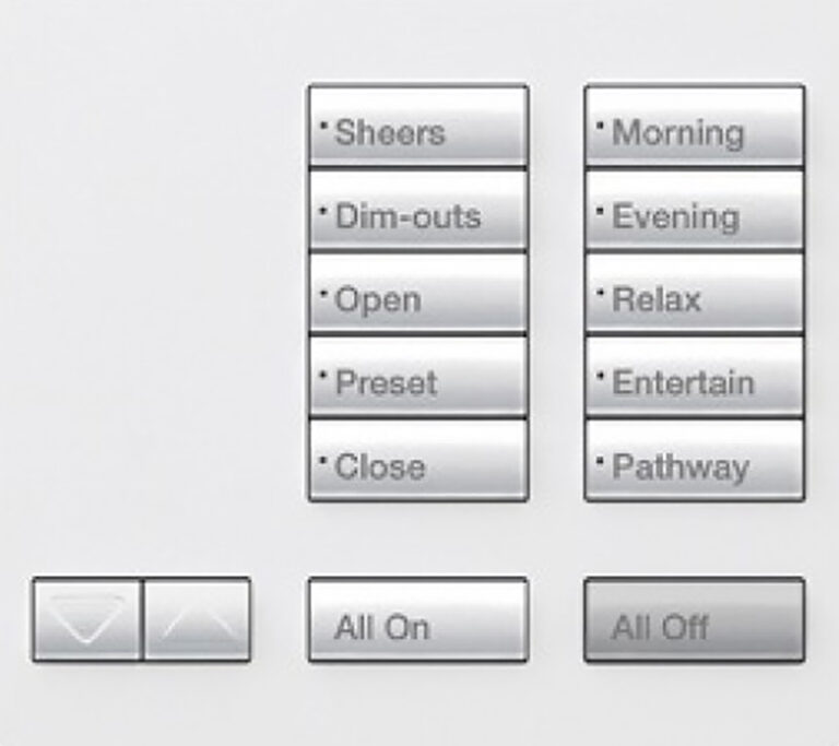 Lutron RadioRA2 seeTouch RF keypads provide a clean, centralized way to control lighting, shades, and temperature throughout your home. As part of the RadioRA2 wireless system, these keypads allow you to manage multiple lights and scenes from a single location, simplifying everyday use. With one touch, you can adjust lighting levels, lower shades, or activate custom scenes tailored to your routine—all through a streamlined, intuitive interface.